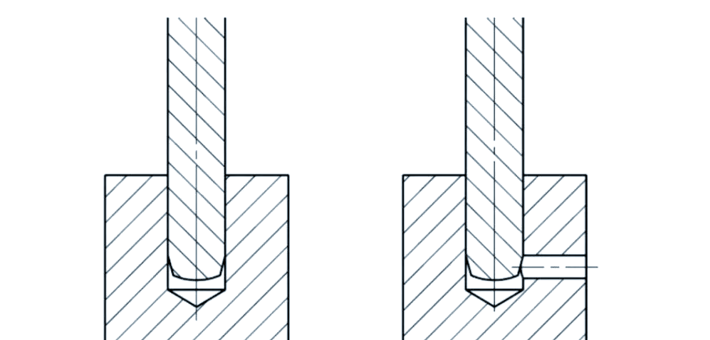 当在盲孔中安装过盈配合轴时,为防止形成封闭空间导致装配与拆卸困难,应预先开设排气孔或槽。