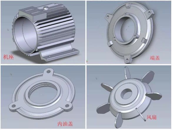 常见的电机零件中,主要包含机座、端盖、内油盖、风扇、冲片等部件,它们的制造工艺,往往都需要针对性进行考量: